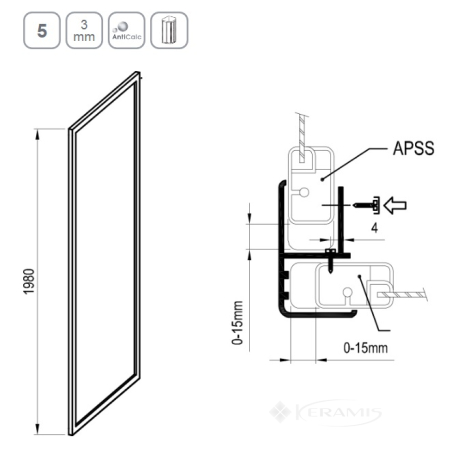 Изделие состоит из одной неподвижной части и не предназначено для самостоятельного использования. В комплектацию изделия входит угловой соединительный профиль для крепления к душевым дверям или душевой кабине. Для крепления к стене используется установочный профиль, который входит в комплектацию душевых дверей или кабины. С помощью регулировочного профиля NPS можно выровнять неровности строительного отверстия. Неподвижная стенка APSS комбинируется с душевыми дверями ASDP3 (высотой 1980 мм) для создания "Г" - образной душевой кабины. С помощью двух неподвижных стенок типа АPSS и душевых дверей ASDP3 создадите "П" - образную душевую кабину. Возможно изготовление атипичных душевых дверей и неподвижной стенки.