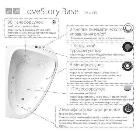 Подходящая ванна для установки системы: ванна LoveStory II 196x139 правая, ванна LoveStory II 196x139 левая.
