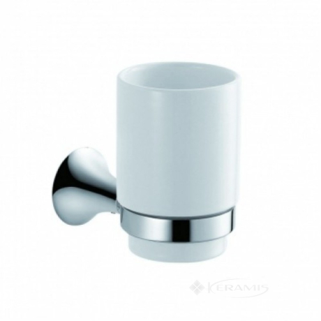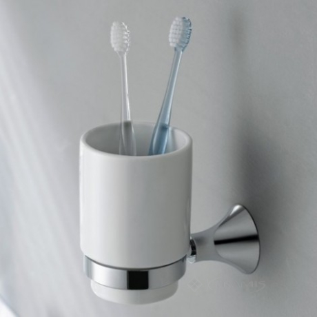 Прочная латунная конструкция Kraus Amnis (KEA-11104BN) с хромовым покрытием крепится к стене и держит изящного керамический стакан