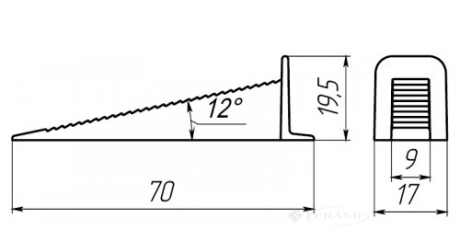 Клин нового СВП сделан из качественного пластика. Изделие имеет угол 12 градусов. Длина – 70 мм. Ширина – 9 мм. К высокой части клина крепится пластина 17х19,5 мм, с помощью которой удобно вставлять клин в основание специальным инструментом или руками.