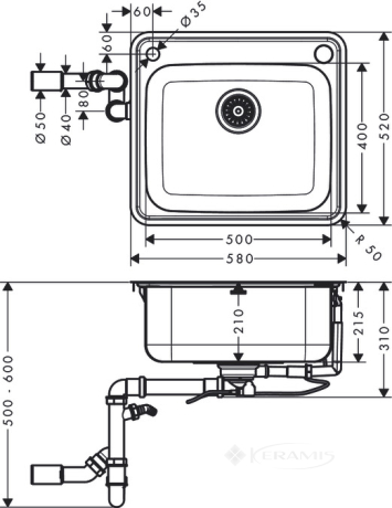 Кухонная мойка Hansgrohe S412-F500 58x52x21,5 нержавеющая сталь (43336800):
