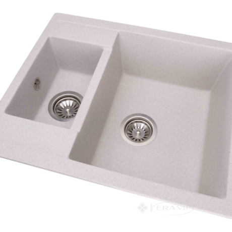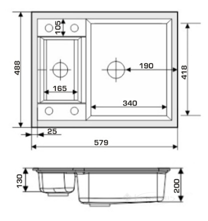 Основная чаша 340мм + полуторная 170мм, без мокрого стола, благодаря чему ее можно врезать в любую маленькую кухню. В состав гранитной мойки входит гранитный песок 80% и акриловая смола 20%.