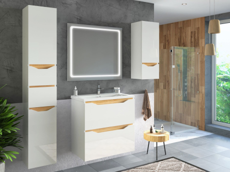 Перейти к подробному описаниюАмелия – серия, воплощение оригинальности и современного дизайна в ванной комнате. Пенал разделен на верхнюю и нижнюю части в соотношении 1/1. В верхней части одна полка, изготовленная из ДСП белого цвета толщиной 16 мм. На нижней части расположена корзина для белья. Дверца на петлях с плавным доводом. Пенал имеет два ящика с телескопическими направляющими. Изделие имеет интегрированную гармонично выглядящую ручку. Цвет – белый с декоративными вставками дуб сонома. Корпус – ламинированное ДСП толщиной 16 мм. Фасад – МДФ двустороннего ламинирования толщиной 16 мм. Комплектуется модель ножками из хрома. Пенал поставляется в собранном виде.