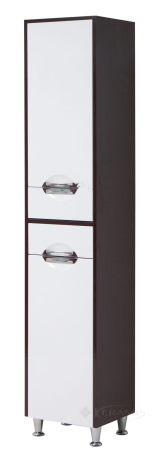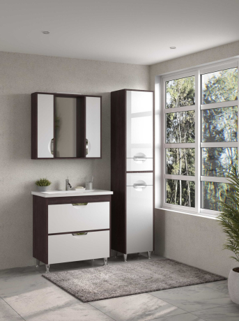 Лора венге – серия, воплощение оригинальности и современного дизайна в ванной. Пенал разделен на верхнюю и нижнюю части в соотношении 1/1. В верхней части одна полка, изготовленная из ДСП белого цвета толщиной 16 мм. На нижней части расположена корзина для белья. Дверца на петлях с плавным доводом. Пенал имеет два ящика с телескопическими направляющими. Изделие имеет интегрированную гармонично выглядящую ручку. Цвет – фасад белый с корпусом венге. Корпус – ламинированное ДСП толщиной 16 мм. Фасад – МДФ двустороннего ламинирования толщиной 16 мм. Комплектуется модель ножками из алюминия. Пенал поставляется в собранном виде.