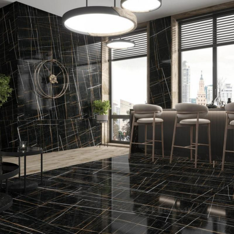 Кристаллическая поверхность Sahara в черном цвете – это исключительно элегантное решение. Глубокий оттенок черного, сочетающийся с блеском полировки, придает интерьеру роскошь и современный стиль, создавая настоящий оазис стиля.