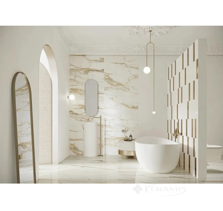 Натуральный камень с характерными золотыми прожилками послужил вдохновением для создания дизайна полного элегантности. Оригинальная текстура и цвета камня были перенесены на поверхность плитки. Цветовой контраст фона и прожилок создает на поверхности впечатление глубины, которое еще больше усиливается благодаря сатинированной и матовой поверхности с элементами блеска.
