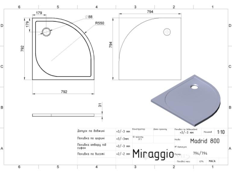 Перейти к подробному описаниюПоддон Miraggio Madrid 800 79,4x79,4 серый матовый (643) - поддоны MIRAGGIO производятся по авторской технологии смешивания кварцевого песка и полиэфирной смолы в вакууме. Материал поддона – MIRASTONE. Изделия имеют однородную текстуру и цвет по всей толщине стен. В его структуре отсутствуют микропоры, исключающие развитие бактерий на поверхности изделия. Поверхность поддона – матовая.