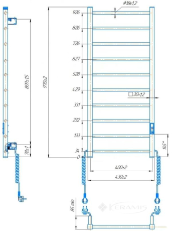 Перейти к подробному описаниюЭлектрический полотенцесушитель Mario HF Leeds 970x430. Работает по технологии сухого ТЭНа. Оборудована встроенным таймером-регулятором и коннектором для подключения к питанию с любой стороны. Оснащена комплектом для скрытого подключения. Модель имеет 10 ребер из круглой трубы и стойки из квадратного профиля. Материал – черная сталь с антикоррозионной обработкой. Варианты покрытия: черный или белый мат. Температурные режимы таймер-регулятора: 40°С, 45°С, 50°С. Время работы: 3,6 часов или постоянный нагрев. Мощность 120 Вт. Гарантия – 3 года