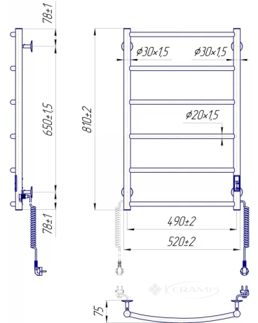 Электросушилка для полотенец бытовая Классик НР-І 800х530/85 TR К. Оборудована таймером-регулятором и коннектором для подключения в розетку с любой стороны. Совместима с комплектом скрытого подключения. Имеет 6 ребер и стояк из круглой трубы. Изготовлен из полированной нержавеющей стали без хромирования. Варианты покрытия: полированный или сатин, черный мат, белый глянец, золото, бронза. Температурные режимы таймер-регулятора: 40°С, 45°С, 50°С. Варианты времени: 3, 6 часов и постоянный нагрев. Мощность: 100 Вт. Дополнительно для удобства использования можно оснастить навесными крючками. Гарантия – 5 лет.