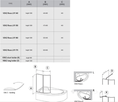 Перейти к подробному описаниюШторки предназначены для ванны ROSA, состоят из одной неподвижной и одной откидной части, которую можно легко сложить вовнутрь (над ванной). Изделие поставляется в трех размерах, в левом и правом вариантах. Материал полистирольное или безопасное стекло. Шторки крепятся к стене ванной комнаты с помощью короткого или длинного держателя, который улучшает прочность шторки и одновременно служит вешалкой для полотенца. Держатель части неподвижной шторки для ванны не входит в комплект изделия.