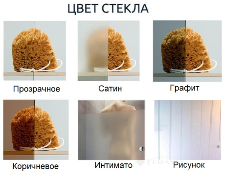 Шторка для ванны может быть изготовлена из разных вариантов стекол: прозрачное, сатин, графитовое, коричневое, интимато и рисунок (любой на выбор заказчика). Стоимость сообщит менеджер.
