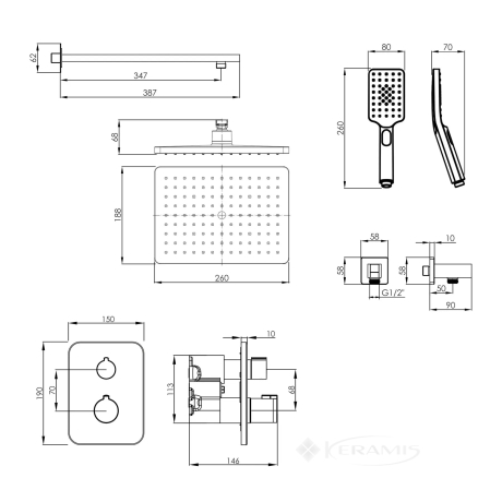 - Состав комплектадушевая система с термостатом, верхним и ручным душем