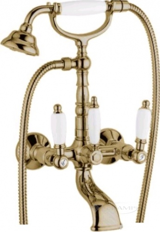 Смеситель оснащён двумя рычагами смешивания и регулирования холодной – горячей воды и дополнительным рычагом переключения на душ. В стандартную комплектацию входят – две эксцентрические муфты для настенного монтажа, два декоративных отражателя, душевой шланг, душевая лейка. Цельно - литой корпус смесителя изготовлен из экологически чистого материала (латунь) с декоративным напылением в цвете: бронза.