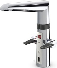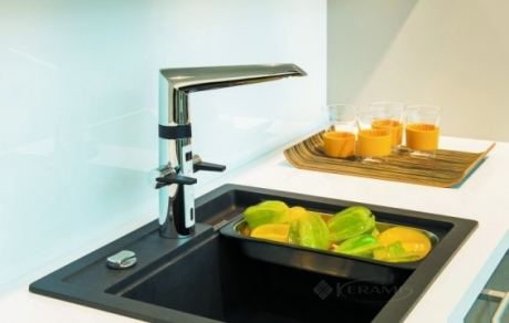 Перейти к подробному описаниюСмеситель для кухни с удобными рукоятками для горячей и холодной воды, бесконтактной функцией, дисплеем для отображения температуры воды, высоким поворотным изливом, аэратором. Расход горячей и холодной воды регулируется отдельными рукоятками. Угол поворота излива составляет 120° (заводская установка). По желанию поворот излива может быть ограничен до 60° или 80°. Для активации бесконтактной подачи воды поднесите руки к датчику. Температура воды при бесконтактной работе регулируется поворотом кольца между смесителем и изливом. Бесконтактная функция легко включается/ выключается. Работает от трансформатора 230/5 В (входит в комплект поставки). Смеситель оснащен грязевыми фильтрами