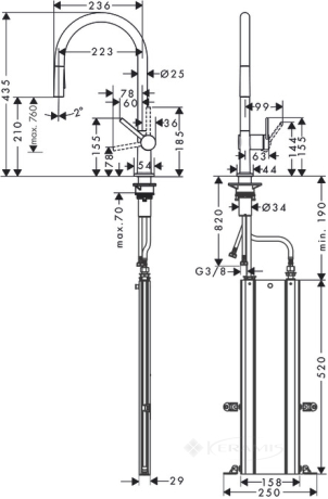 - угол поворота излива: регулировка на 4 уровня 60°, 110°, 150° или 360°