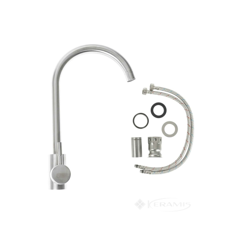 Длина излива составляет 200 мм, предоставляя достаточно простора для удобного расположения посуды и сковородок. Комплектация включает в себя два шланга длиной 50 см, что придает смесителю дополнительную универсальность и гибкость в использовании. В комплект также входит крепеж для смесителя, что делает его легким в установке и надежно закрепляет на месте.