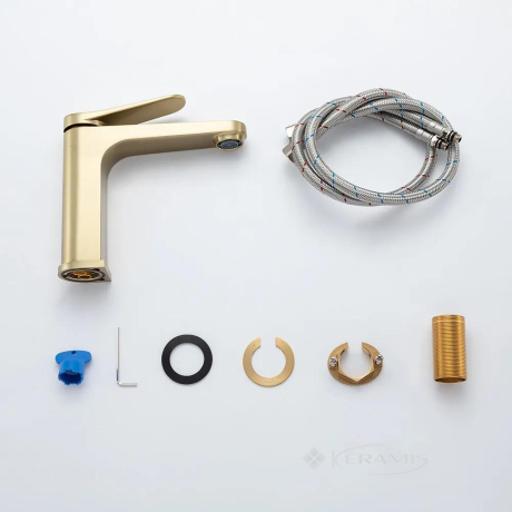 Китай, гарантия от произв. - 1 год, цвет: сатин золотий, материал: латунь, однорычажный, установка на умывальник, механизм: керамический картридж