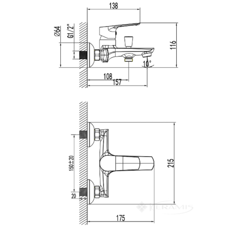 Италия, гарантия от произв. - 5 лет, цвет: хром, материал: латунь, однорычажный, установка на стену, механизм: керамический картридж