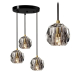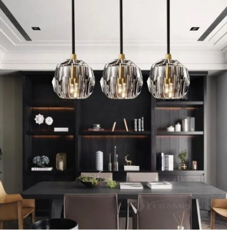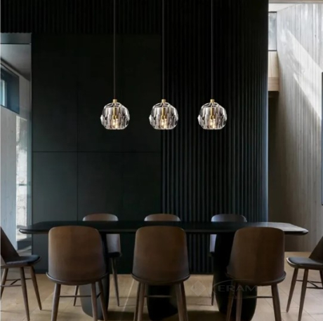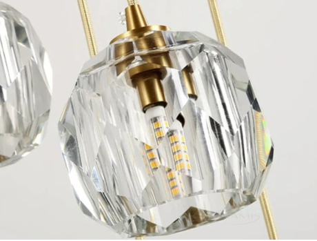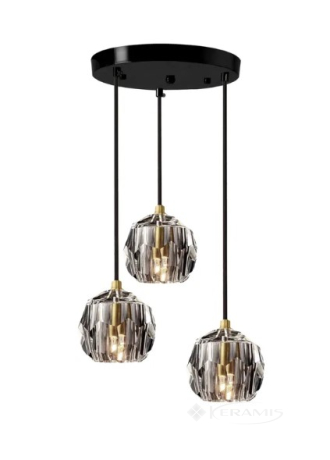 Лампа имеет три абажура, провода и металлическую крышку на потолке. Оснащен самой популярной резьбой под лампочку G9.