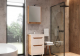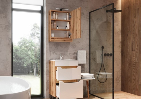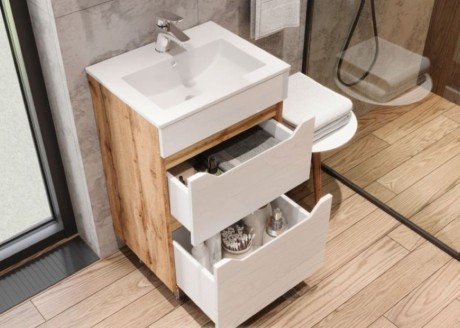 Снаружи поверхность тумбы украшена глянцевой эмалью белого цвета или выполнена в сочетании глянцевой белой эмали (фасады) и матового декора Дуб Вотан (корпус).