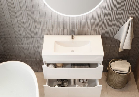 Снаружи поверхность тумбы украшена глянцевой эмалью белого цвета или выполнена в сочетании глянцевой белой эмали (фасады) и матового декора Дуб Вотан (корпус).
