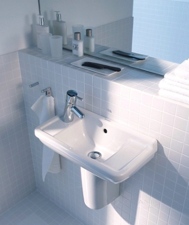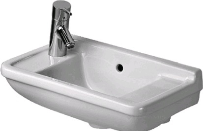 Перейти к подробному описаниюУмывальник для рук с переливом, с плоскостью под смеситель, намеченное отверстие для смесителя слева и справа, 500 мм, В сочетании с полупьедесталами нельзя использовать донный клапан с горизонтальным рычагом