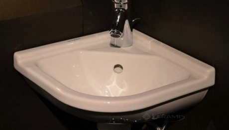 Перейти к подробному описаниюУгловой умывальник для рук с переливом, с плоскостью под смеситель, вес 6,2 кг