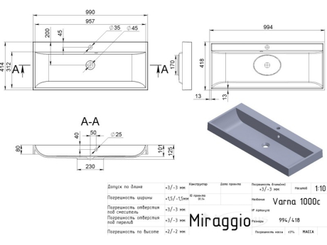 Умывальник Miraggio Varna 1000 99,4x41,4 белый матовый - изготовлен из кварцевого песка по технологии MIRASTONE, врезной, с отверстием под смеситель и переливом. Вес умывальника составляет 24,5 кг. В состав смеси входит только кварцевый песок, смолы и добавки санитарные. Умывальник не подвергается воздействию красителей, не выгорает на солнце и при правильном уходе прослужит много лет.