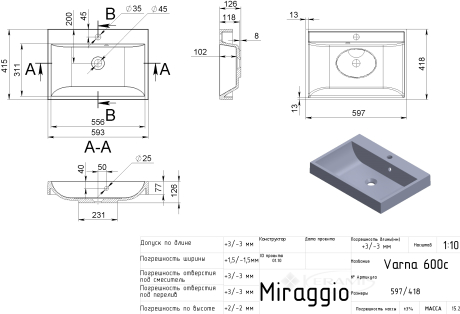 Отзывы о товаре Умывальник Miraggio Varna 600 59,7x41,8 белый матовый1 отзыв