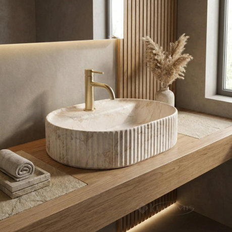 Отделка Saturn вдохновлена натуральным камнем: светлая «мраморная» структура с деликатными прожилками в тёплых песочных тонах создаёт спокойный, но роскошный фон для медной, золотой или чёрной арматуры. Матовая поверхность подчёркивает благородство на светлых и тёмных столешницах. Удобная глубина чаши повышает комфорт, профилированные кромки уменьшают разбрызгивание воды.