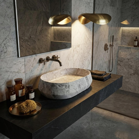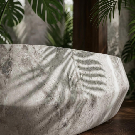 Дизайн “Rock” – светлая поверхность с серыми прожилками и геометрические изломы на внешних стенках придают форме строгий, «сырой» характер.