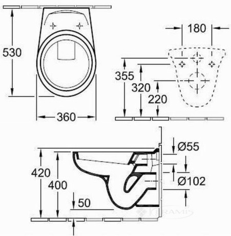 Перейти к подробному описаниюКонсольный унитаз 360 x 530 мм, настенный монтаж, горизонтальный выпуск, крепление 2 болтами M12x150 мм .