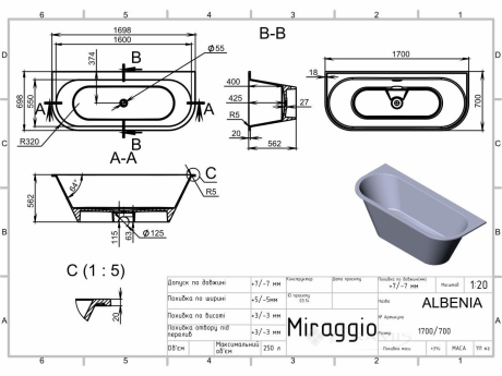 Перейти к подробному описаниюВанна из искусственного камня MIRAGGIO – идеальный вариант дополнения современного интерьера ванной комнаты. Овальная ванна ALBENIA из материала Miramarble – это совершенное творение по дизайну и функциональности. Тип установки ванны - пристенная.