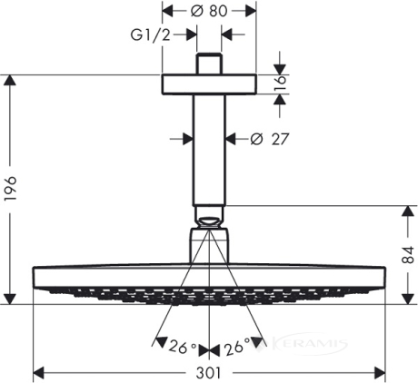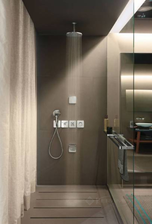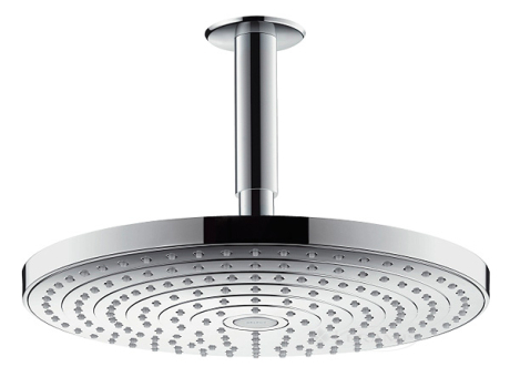размер душевого диска: 300 мм, тип струи: Rain, RainAir (дождевая струя, обогащенная воздухом), расход воды для струи Rain (при 3 бар): 17 л/мин, расход воды для струи RainAir (при 3 бар): 17 л/мин, переключение типов струи: переключение на верхнем душе Select, поверхность душевого диска в двух вариантах: хром или белый, материал душевого диска: металл, съемный душевой диск для очистки, длина потолочного подсоединения: 100 мм, монтаж: потолок