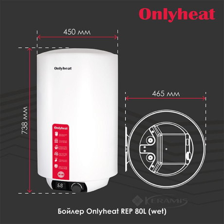 Бойлер Onlyheat REP80L(wet), 80 литров – обеспечит стабильное горячее водоснабжение для вашего дома, квартиры, офиса или дачи. Нагревательный элемент в виде мокрого ТЭНа с мощностью 2000 Вт быстро нагревает воду объемом 80 литров для ежедневного комфортного использования. Бойлер имеет классическую круглую форму и вертикальный способ установки, что позволяет оптимально использовать пространство. Удобное механическое управление с открытым регулятором температуры расположено на корпусе и позволяет легко контролировать уровень нагрева. Благодаря цифровому дисплею можно быстро отслеживать актуальную температуру воды и настройку работы бойлера, что делает его эксплуатацию более удобной и понятной.