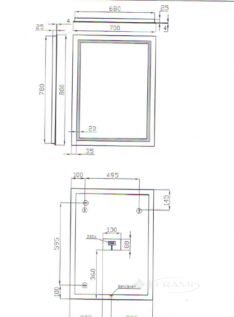 Зеркальное полотно размером 700 на 800 мм установлено на специальные крепления к стене. Глубина зеркала вместе с основанием 25 мм.