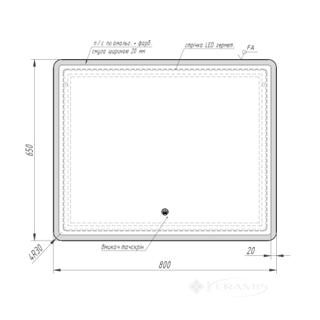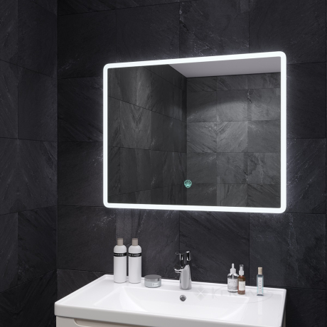 Еще один вариант, доступного LED зеркала ИМИДЖ 80 см шириной, которое оснащено: большими радиусами закруглений углов, сенсором прикосновения, с помощью которого вы легким движением включите периметральную заднюю подсветку (backlit) и ореольную подсветку.