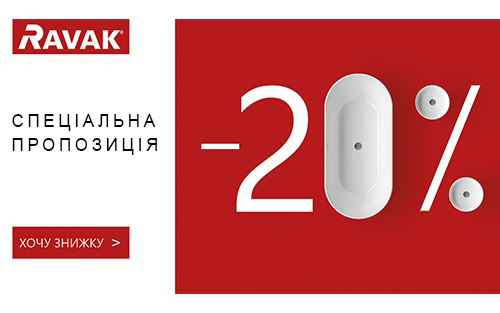 *Скидки -20% действуют с 04.02.2026 по 01.03.2026 по всей Украине (кроме временно оккупированных территорий) на продукцию ТМ «RAVAK». Подробные условия, место проведения акции узнавайте в сети брендовых салонов «RAVAK» и в официальных магазинах сантехники, адреса которых опубликованы на сайте www.ravak.ua. Скидки не суммируются между собой, со скидками других акционных предложений и со скидками любых дисконтных или банковских карт. Организатор акции оставляет за собой право изменять условия и период проведения акции.