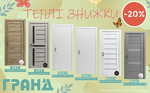 Встречай весенние скидки! -20% на двери бренда ГРАНД! Акция действует с 01.03.2025 по 31.03.2025 г. в сети магазинов KERAMIS.UA!