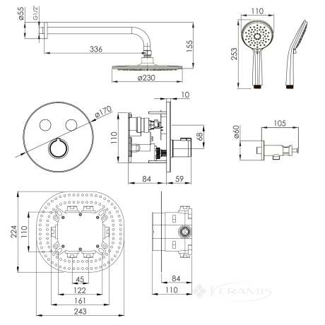 - Склад комплектудушова система зі змішувачем, верхнім і ручним душем