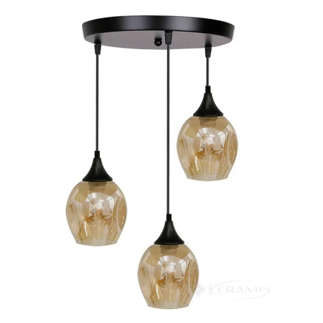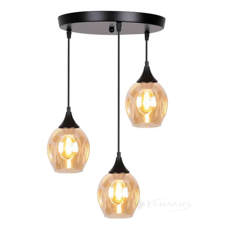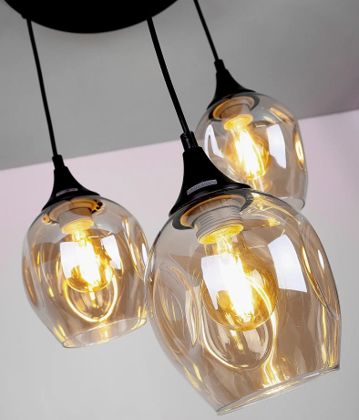 Виготовлена ??зі скла з абажурами і металевою основою, ця люстра одночасно міцна і красива. Чорна основа додає елегантності та чудово контрастує з бурштиновим кольором абажурів. Ширина та висота 39 см - ідеальний розмір для кафе, ресторанів, передпокоїв, кухонь і навіть магазинів.