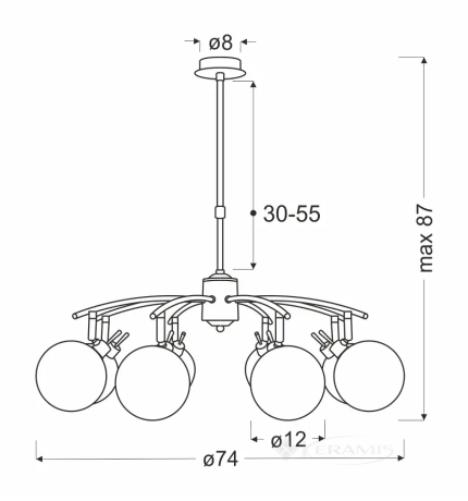 Завдяки 8 ламп з цоколем G9 ця люстра забезпечує ідеальне освітлення для створення сприятливої ??обстановки. При ширині 74 см та висоті 87 см ця люстра має значний розмір, який підкреслить естетику будь-якого приміщення.
