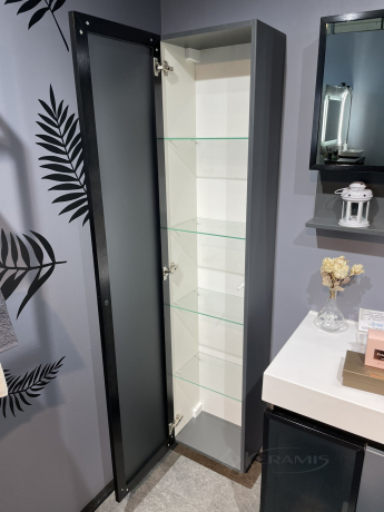 Пенал дозволить розширити зону зберігання ванної кімнати: на скляних полицях за орними дверцятами будуть надійно приховані від вологи всі ваші лазневі приналежності. Двері пенала закриваються легко і безшумно, завдяки механізму доводчика.