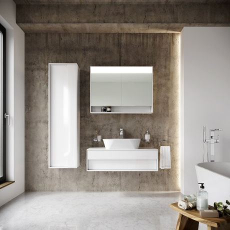 Для цілісного рішення та злагодженості дизайну ванної кімнати ми рекомендуємо комбінувати пенал SB 430 Step з іншими виробами серії Step (дзеркальна шафа MC 1000 Step та тумба під умивальник SD 1000 Step).