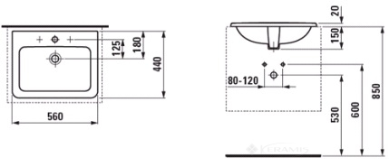 Перейти до докладного описуРаковина, вбудована зверху. Один отвір для змішувача. Без переливу.