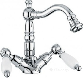 Перейти до докладного описуЗмішувач оснащений двома важелями змішування та регулювання холодної – гарячої води, вилив обладнаний обертається аератором на кульовому шарнірі і укомплектований донним клапаном. Суцільно - литий корпус змішувача виготовлений з екологічно чистого матеріалу (латунь).