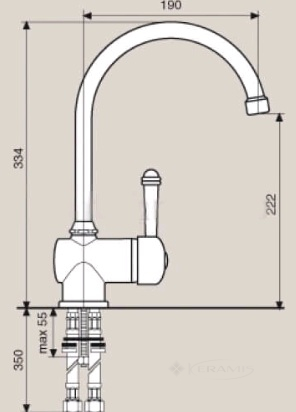 Високий кухонний змішувач з поворотним виливом. Покриття – бронза , верхній вилив , картридж керамічний D40 мм. Змішувач оснащений керамічним дисковим картриджем під один важіль змішування та регулювання холодної – гарячої води, литий латунний корпус.