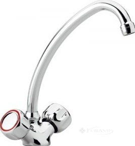 Перейти до докладного описуКухонний змішувач оснащений двома бочкоподібними вентилями змішування та регулювання холодної – гарячої води. Обладнаний високим поворотним виливом дугоподібної форми з великим радіусом дії і збільшеним робочим простором, що дозволяє його використовувати для мийок як з однієї, так і двома чашами. Корпус змішувача виготовлений з екологічно чистого матеріалу (латунь).