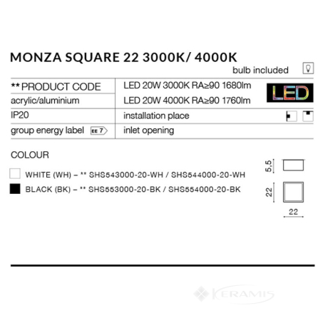 Польща, гарантія від виробника - 1 рік, лампа: світлодіодна (led), цоколь: led, макс. потужність: 20 вт, кількість ламп: 1 шт, ступінь захисту: ip20
