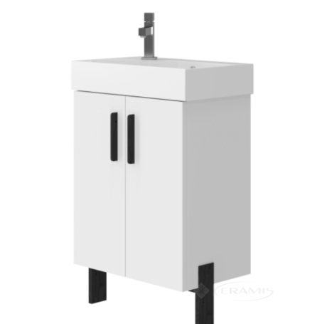 Тумба може бути як підвісною (має кріплення до стіни), так і підлоговою – для встановлення тумби на підлогу в комплекті постачаються дві ніжки.
